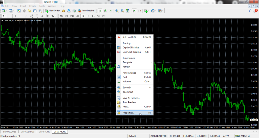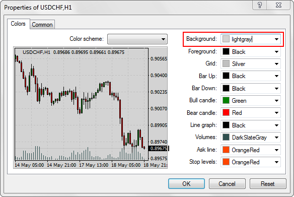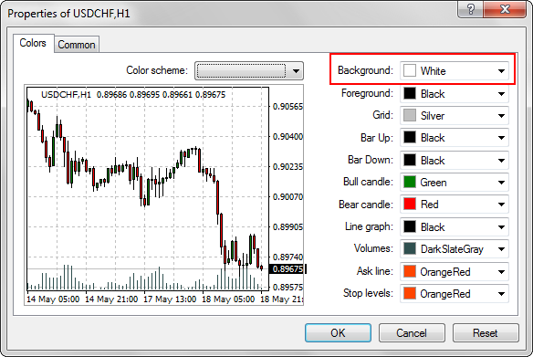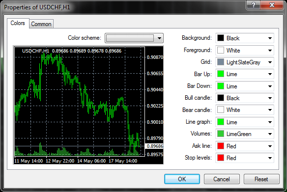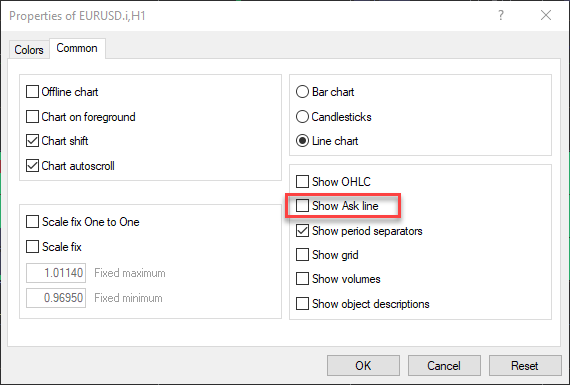 If for some reason the spread isn't visible - RIGHT CLICK in the market watch area and select the spread option. Should also enable the ASK LINE on the chart. Press F8 on the keyboard or follow the instructions about the COLOR SCHEME above. Once you're at the settings part of things - go to the COMMON tab and enable the ask line.
