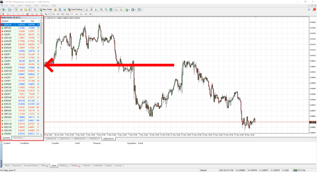 You first need to hit the market watch option at the top of the toolbar. You can also open it by pressing CTRL+M. You should then see your available symbols (pairs) along with the bid, ask and spread.
