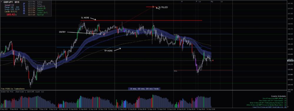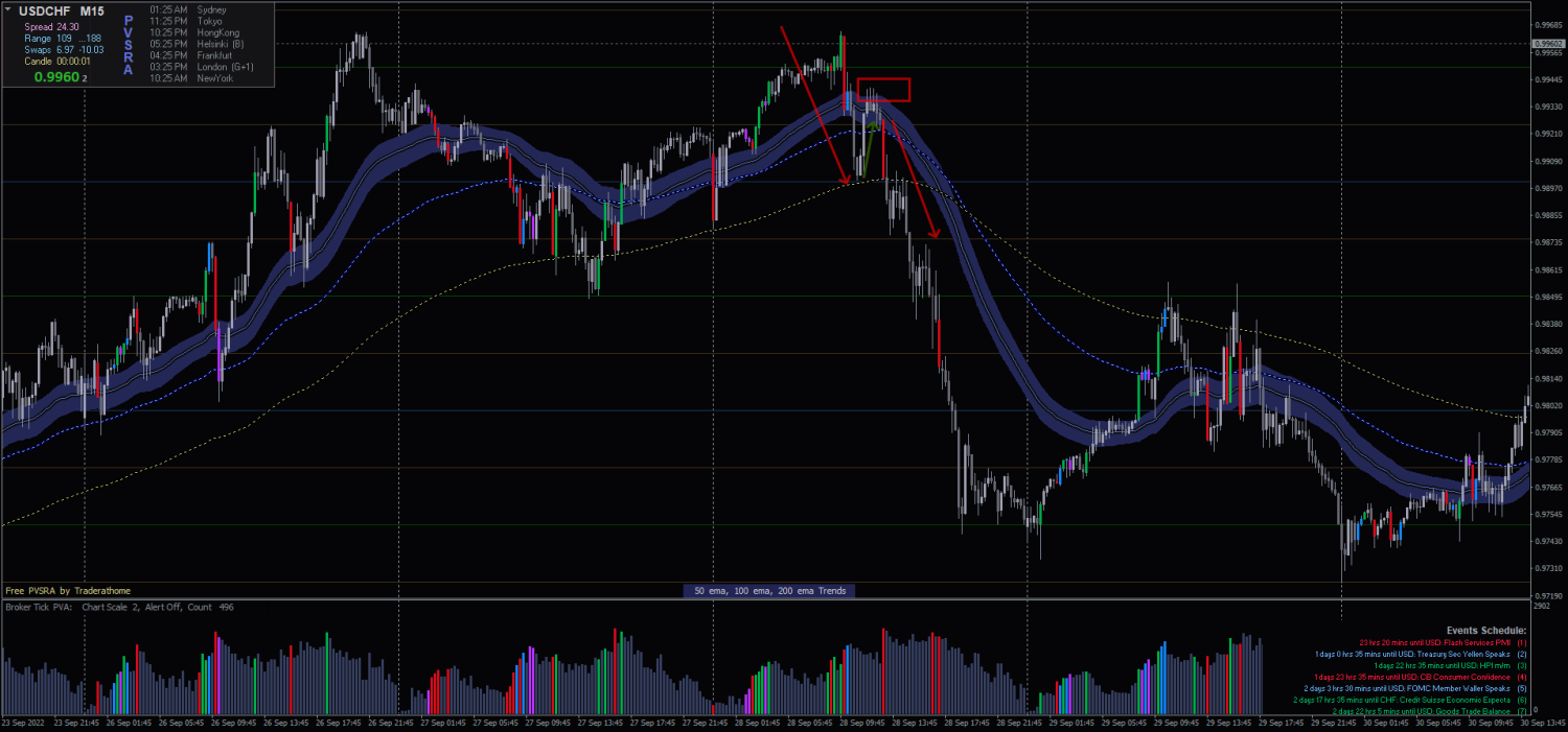 Price made a double top on the H4. You zoom in on the M15 to check it out. Price broke the 50EMA and went down to the 200EMA. Bounced back up but did not break the high. Your entry is off any of the candles that made pins to the high. SL is above the high. Your TP is anywhere between where it is and back to the MA on the H4 timeframe. Or H1 if you want to look there as well. To follow PVSRA - your TP is actually a minimum of 20 pips (200 points).